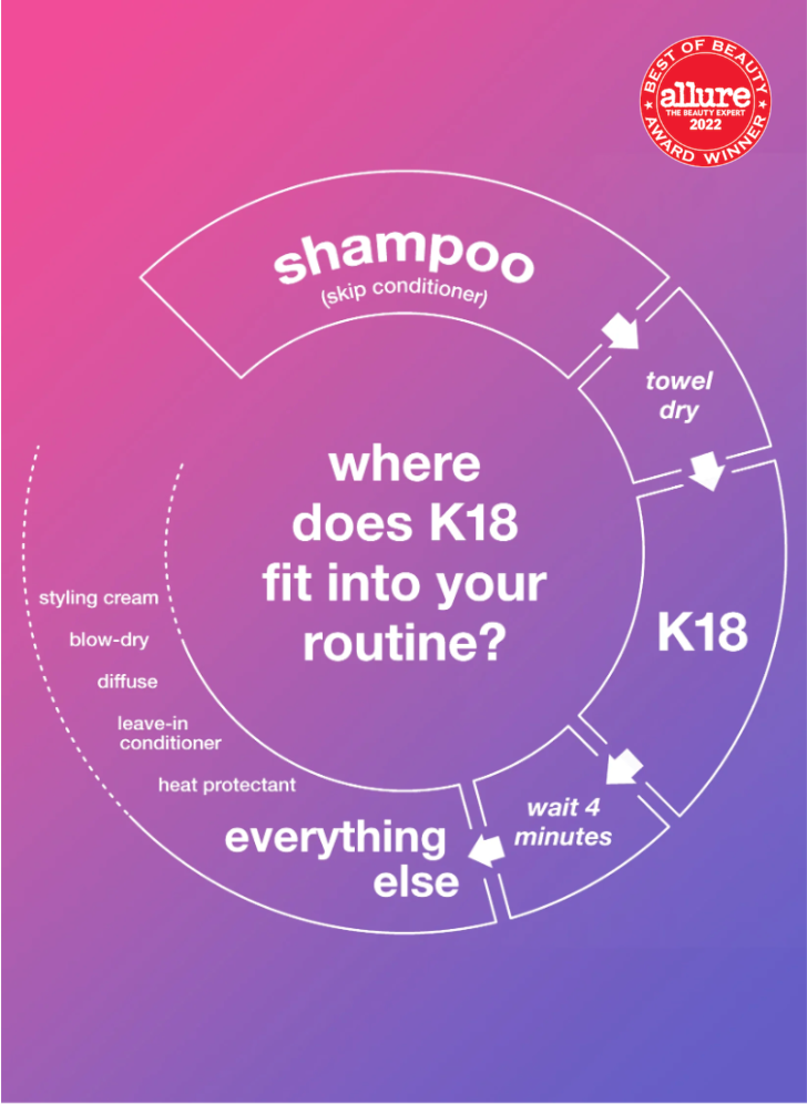 - Begin with 1 pump of K18 Mask & add more as needed depending on the length, thickness, and condition. Work evenly into hair, one pump at a time, from ends to roots.